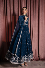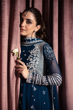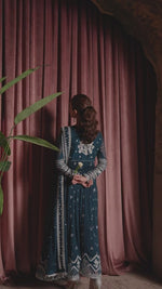 Introducing Aquatic Whisper—an exquisite three-piece ensemble in captivating teal blue crafted to leave a lasting impression. Featuring a hand-embellished chiffon front bodice and a sequin-embroidered chiffon dupatta, this luxe outfit flows with elegance and sophistication, perfect for unforgettable occasions.