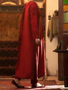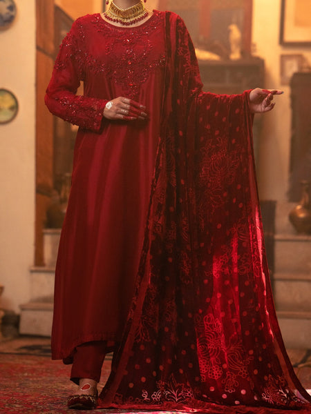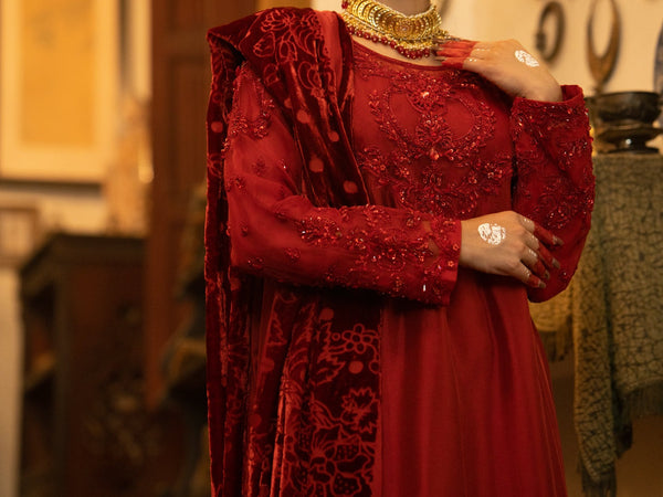 This Exquisite Red 3-piece Ensemble features a Luxurious Shisha Silk Long-length Shirt, adorned with Organza Embroidery and Embellished Sleeves and Neckline. Paired with Fitted Pants and a Rich Velvet Palachi Dupatta.